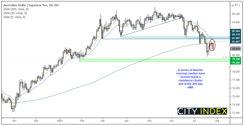 澳元/日元日图处于下跌趋势中,但过去6个时段有5个时段构成逆势行情。但小型看跌锤子K线、上吊线反转K线和看跌外包K线的组合暗示波段高点或已于81.66形成。而且,阻力位在200和10天指数移动均线。另外,近期的回调未能回踩2月低点。