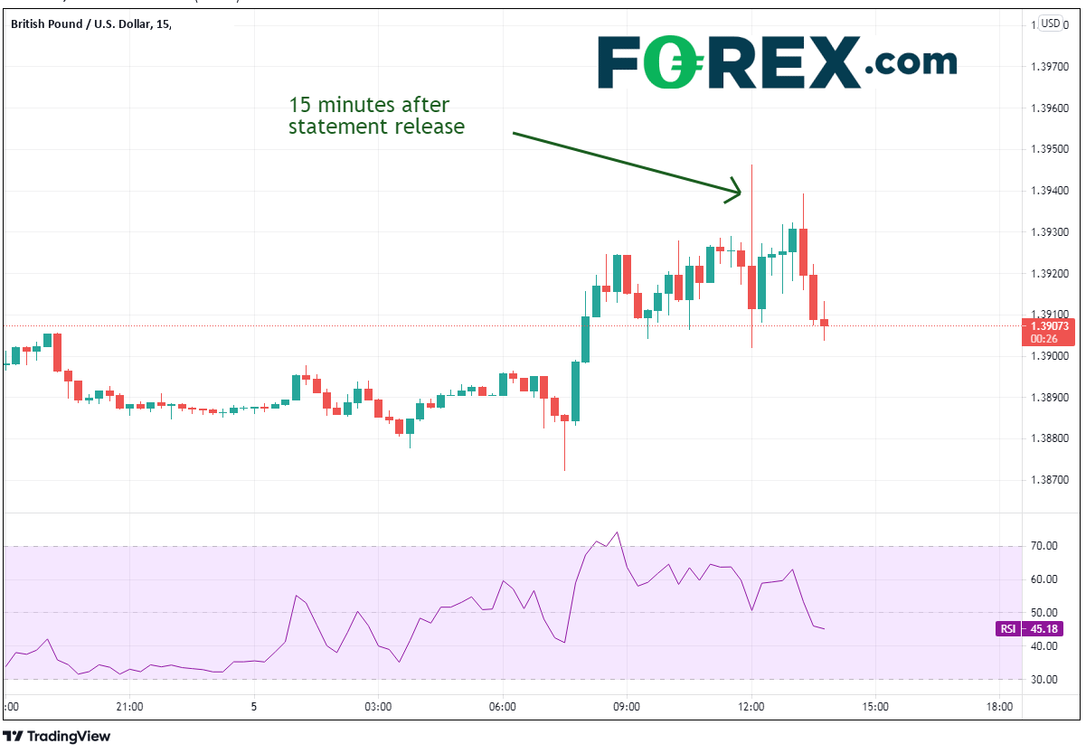 在上述声明发布时英镑/美元极度震荡,声明发布后的15分钟里交投于1.3872-1.3946区间。