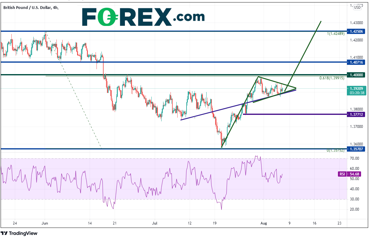 4小时图上,英镑/美元本来看起来要走出一个头肩底形态,结果是一个三角旗形态(没有出现头肩底形态需要的对称性走势)。不过,不管是头肩底还是三角旗,都是看涨形态。在7月20日自1.3570低点反弹后,价格回到6月1日高点到7月20日低点的61.8%回档位1.3980附近并休整。7月30日以来,该货币对一直在一个三角旗形态内盘整。该形态的目标是三角旗突破点位加上旗杆的长度,本例中为1.4310附近。