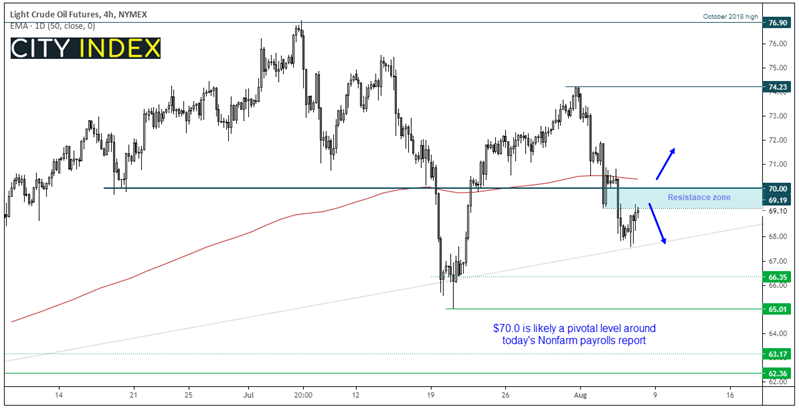 西得州原油4小时图仍处于下跌趋势中,但在上升趋势线企稳。然而,当前环境下隔夜油价的反弹力度不强,而且Delta变异病毒的肆虐继续打击需求前景。所以,如果70.0继续构成阻力约束上涨空间,我们短线保持看跌。而若站上50天指数移动均线,可以假设调头向上。
