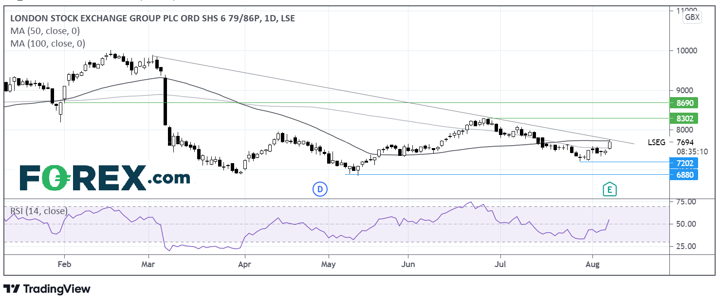 LSEG股价今天早盘上涨4.4%至7788.0便士。